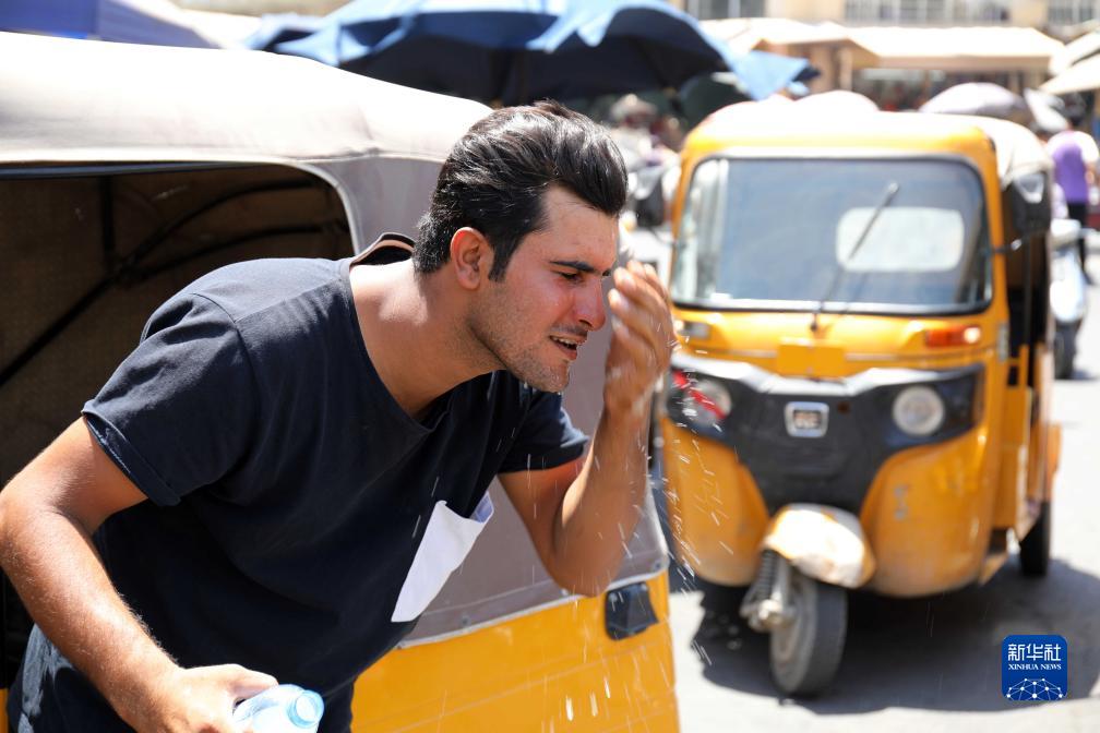 7月18日,在伊拉克巴格達,一名男子用水洗臉降溫。