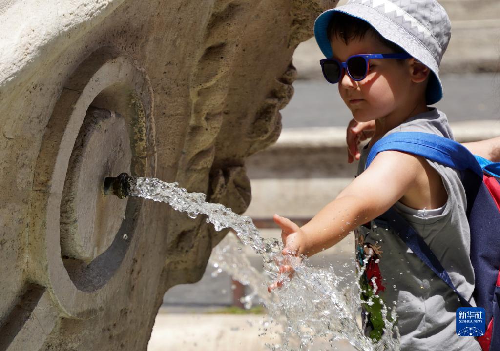 7月18日,一名兒童在意大利羅馬西班牙廣場的噴泉處沖涼。