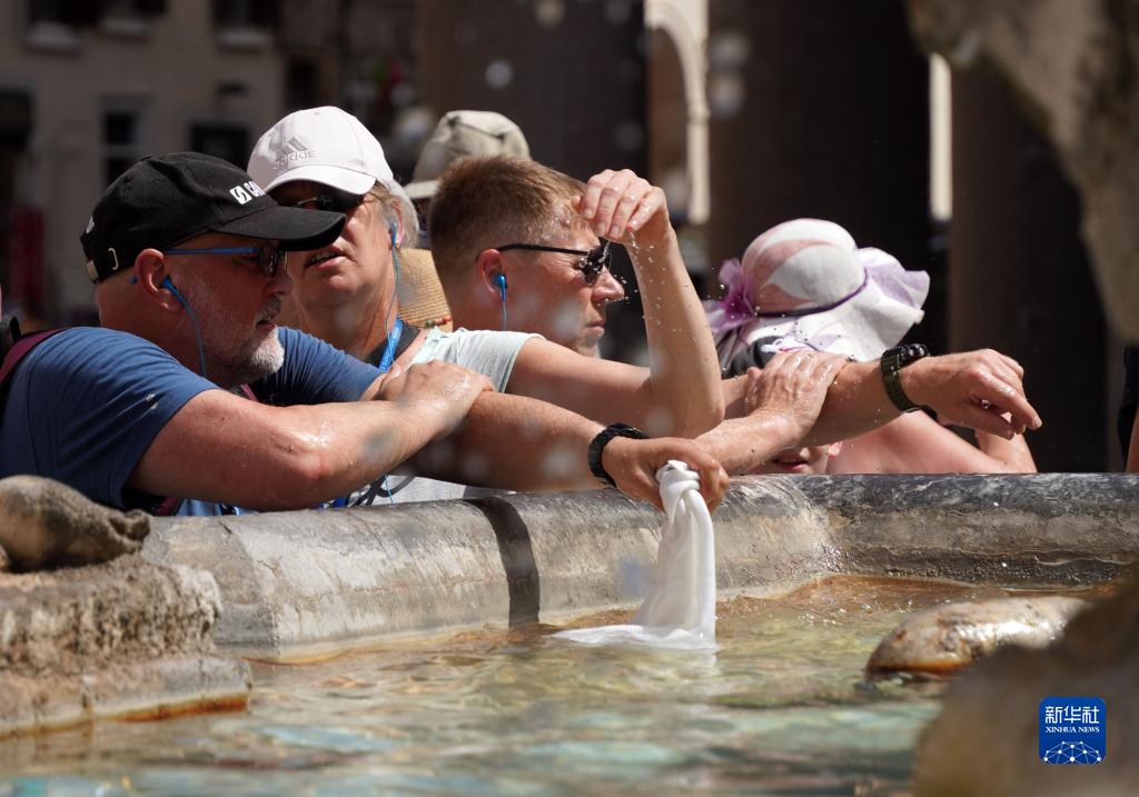 7月18日,游客在意大利羅馬的一處噴泉解暑降溫。