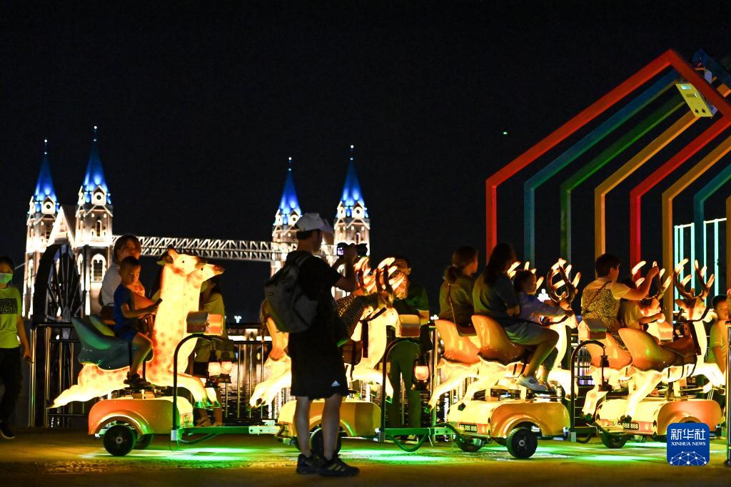 在新疆布爾津縣七彩河休閑旅游度假區,游客乘坐觀光車游覽(7月18日攝)。