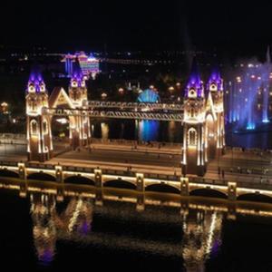夜幕降臨,在新疆阿勒泰地區布爾津縣七彩河畔,3D全息投影技術水幕全息燈光秀表演吸引大批游客駐足觀看。