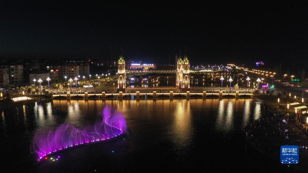 夜幕降臨,在新疆阿勒泰地區布爾津縣七彩河畔,3D全息投影技術水幕全息燈光秀表演吸引大批游客駐足觀看。