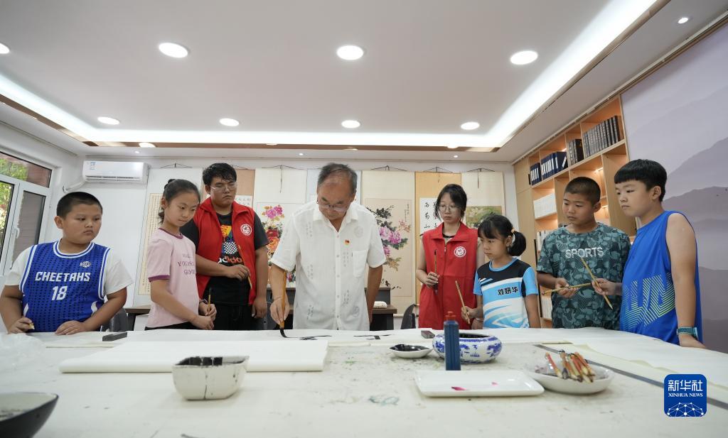 7月19日,書法愛好者在河北省唐山市豐南區新華社區開辦的“愛心暑托班”上為孩子們講解書法知識。