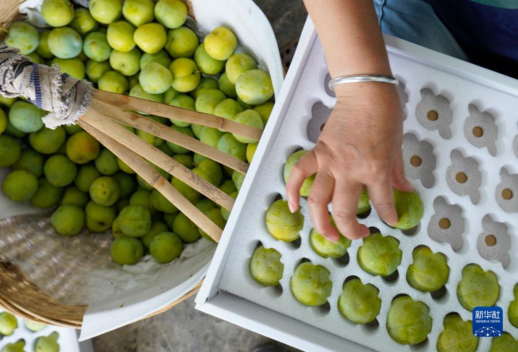 6月29日,在重慶市巫山縣巫峽鎮文峰村的巫山脆李種植園內,種植戶將新鮮的巫山脆李裝箱準備發往外地。