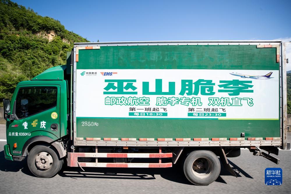 6月30日,在重慶市巫山縣,載著巫山脆李的中國郵政物流車行駛在高速公路上。