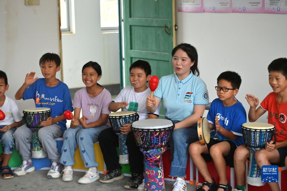 7月18日,在柳州市融安縣泗頂鎮中心小學,大學生在音樂課堂上給小學生上課。