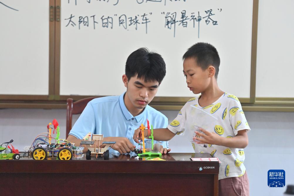 7月18日,在柳州市融安縣泗頂鎮中心小學,大學生在指導小學生組裝機器人。