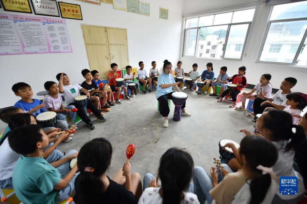 7月18日,在柳州市融安縣泗頂鎮中心小學,大學生在音樂課堂上給小學生上課。