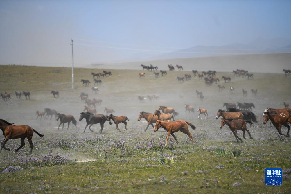 這是在新疆伊犁哈薩克自治州昭蘇縣一處草地拍攝的馬群(7月16日攝)。