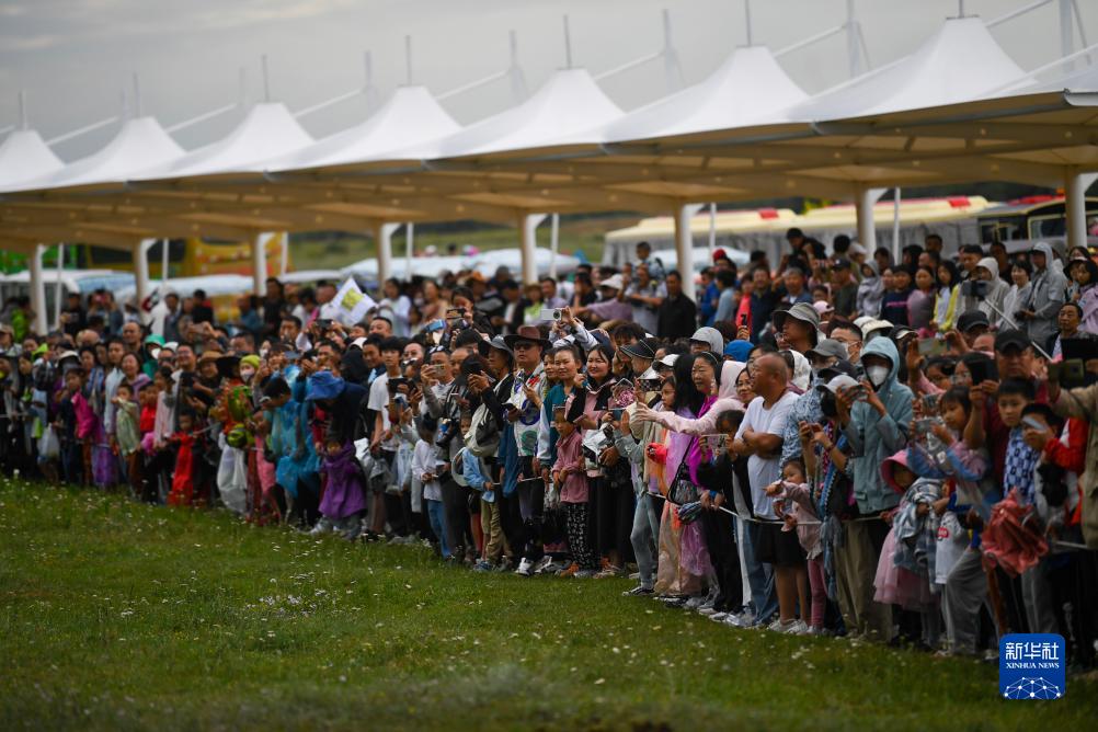 游客在新疆伊犁哈薩克自治州昭蘇縣濕地公園景區觀看牧民表演(7月17日攝)。