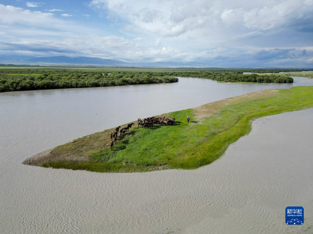 這是7月17日在新疆伊犁哈薩克自治州昭蘇縣濕地公園景區拍攝的馬群(無人機照片)。