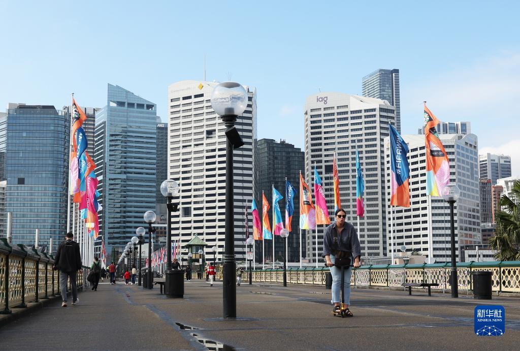 7月17日,在澳大利亞悉尼,人們行走在裝飾有2023女足世界杯旗幟的一座大橋上。
