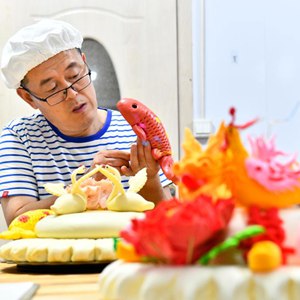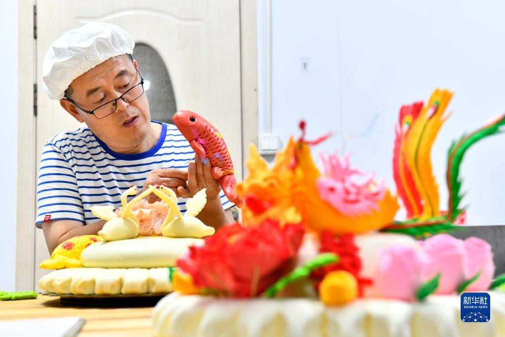 7月19日,在威海市文登區林榮濤花餑餑工作室,非遺傳承人林榮濤在制作花餑餑。