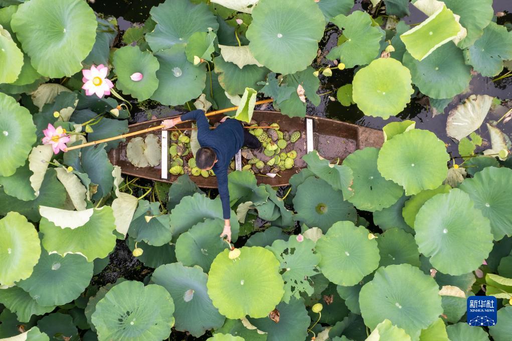 7月19日,在南縣華閣鎮光復漁村,村民在采收蓮蓬(無人機照片)。