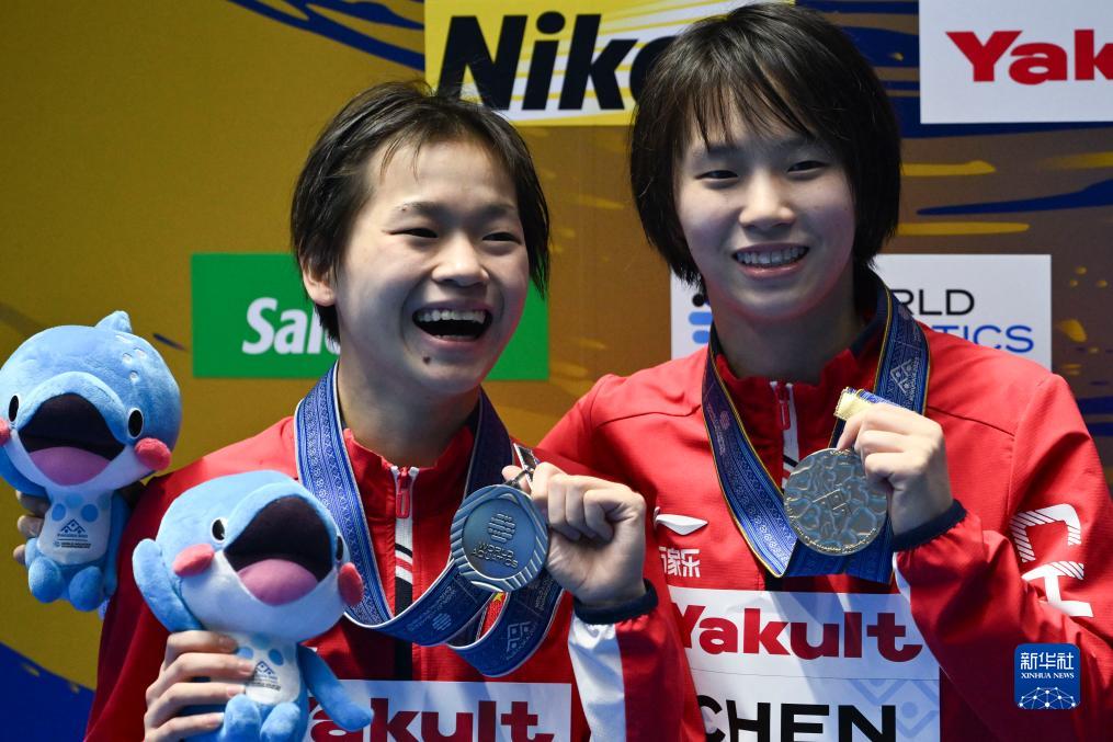 當日,在日本福岡舉行的2023年世界游泳錦標賽女單10米跳臺決賽中,中國選手陳芋汐、全紅嬋分別以457.85分與445.60分的成績包攬冠亞軍。