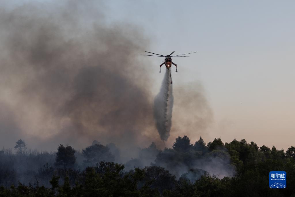 7月18日,在希臘雅典郊外的曼茲拉附近,一架直升機進行滅火作業。