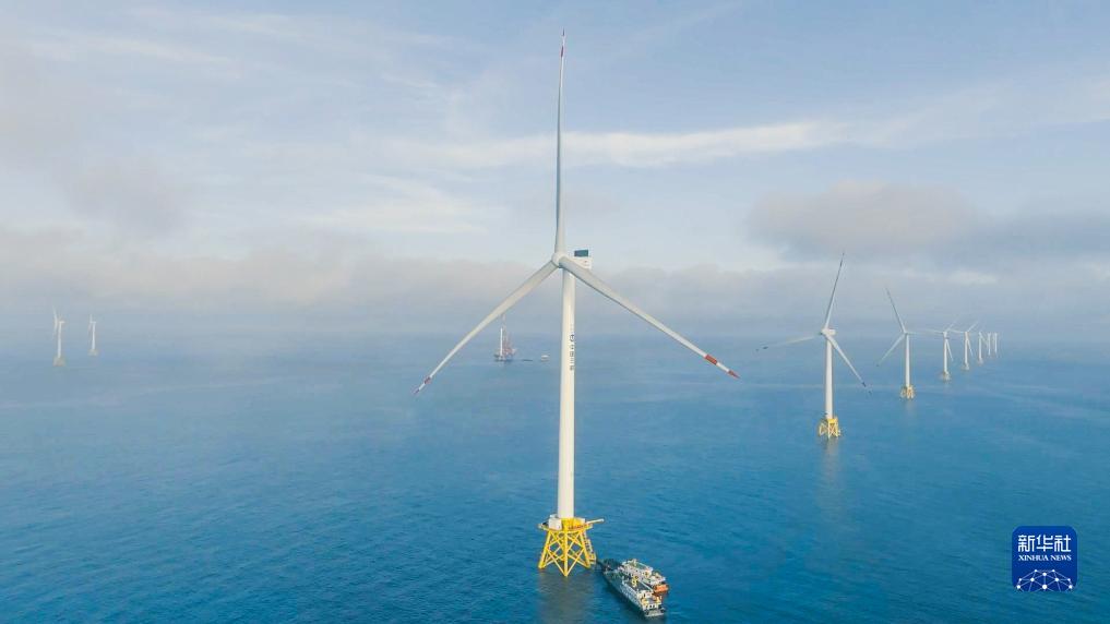 這是在三峽集團福建海上風電場成功并網發電的16兆瓦超大容量海上風電機組(無人機照片,7月19日攝)。