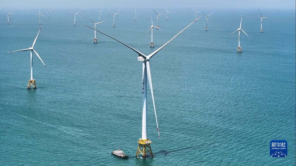 這是在三峽集團福建海上風電場成功并網發電的16兆瓦超大容量海上風電機組(無人機照片,7月19日攝)。