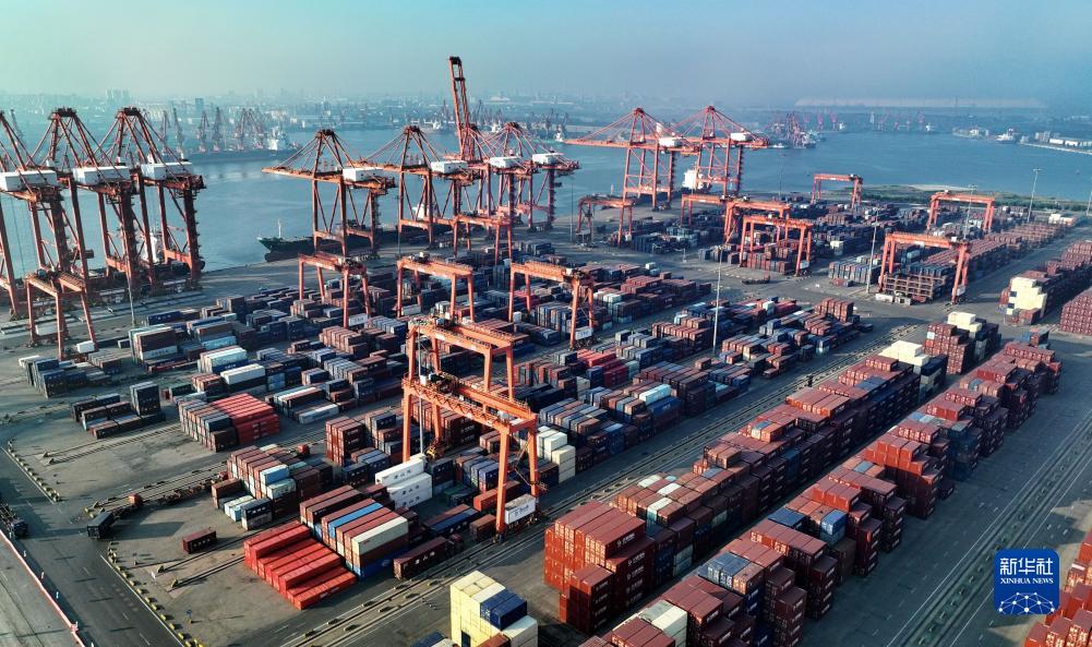 7月19日拍攝的唐山港京唐港區集裝箱碼頭(無人機照片)。