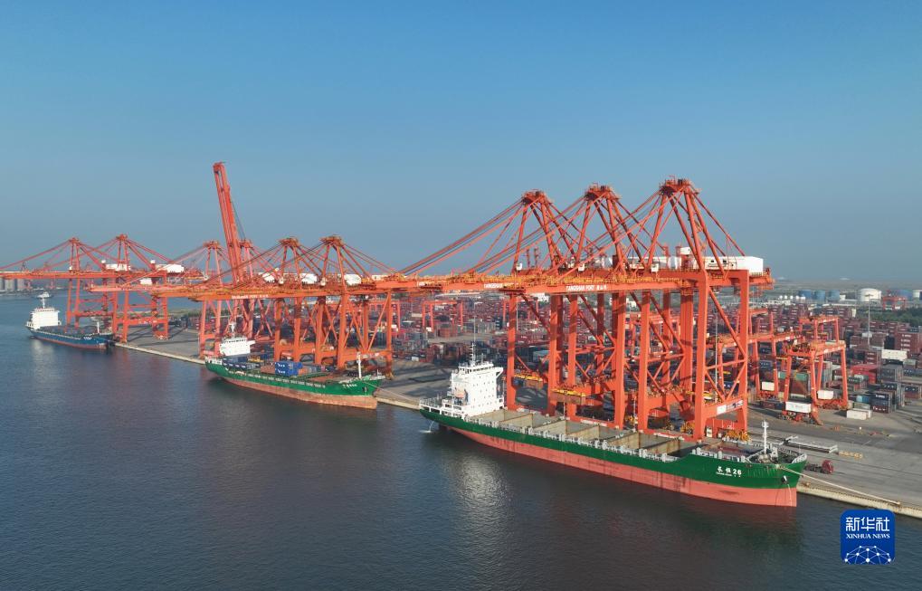 7月19日,三艘輪船靠泊在唐山港京唐港區集裝箱碼頭裝貨(無人機照片)。