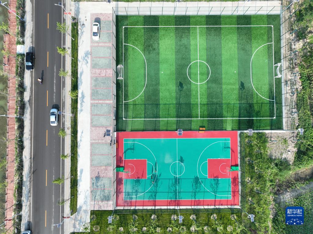 河北省唐山市豐南區趙新莊村內新建的足球場和籃球場(7月19日攝,無人機照片)。