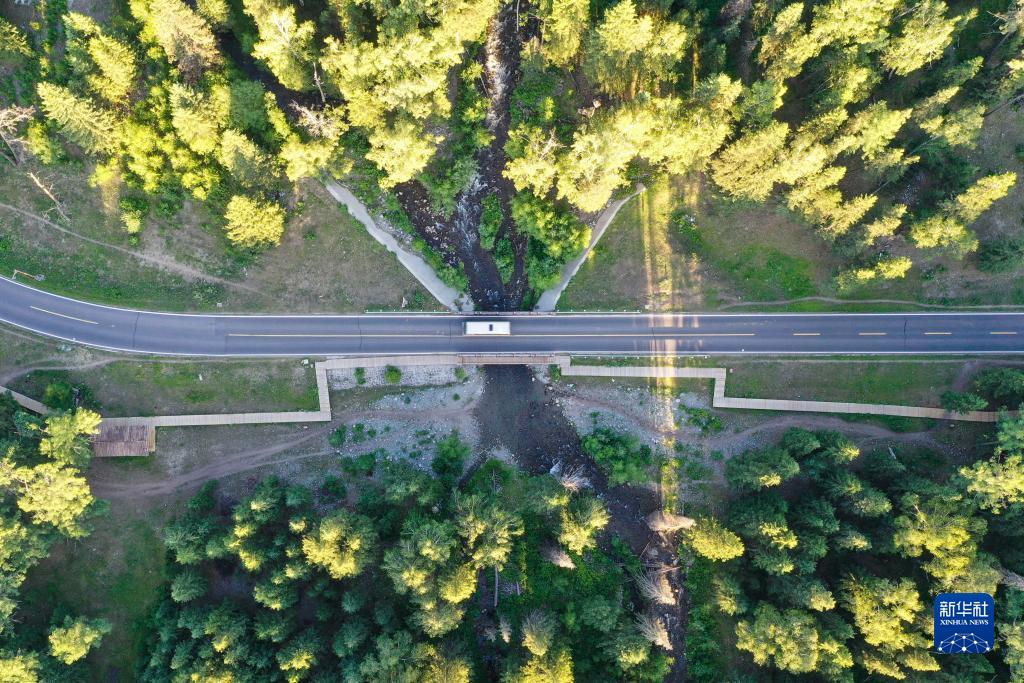 一輛旅游大巴車沿著盤山公路進入新疆阿勒泰地區喀納斯景區(7月19日攝,無人機照片)。