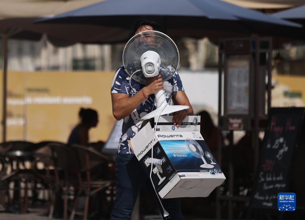 7月19日,一名男子搬著電風扇走在法國南部城市蒙彼利埃街頭。
