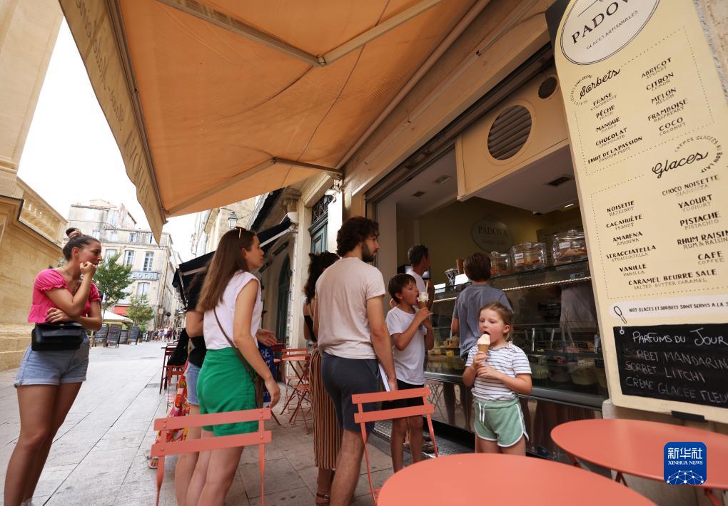 7月18日,在法國南部城市蒙彼利埃,人們排隊買冰激凌。