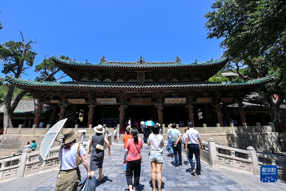 游客參觀晉祠圣母殿和殿前的十字形古橋魚沼飛梁(7月4日攝)。