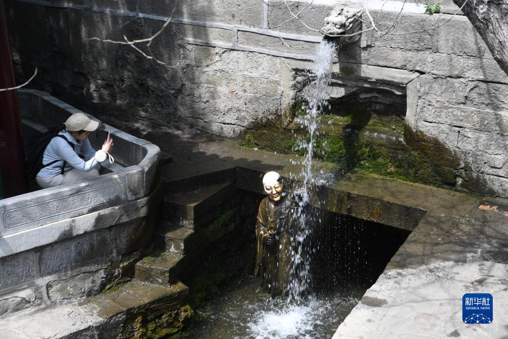 游客在晉祠難老泉旁的出水口拍照(6月16日攝)。