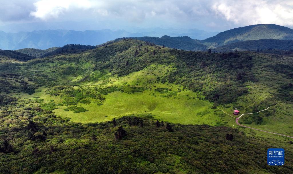 這是7月19日在陜西省漢中市留壩縣拍攝的紫柏山景區草甸景色(無人機照片)。