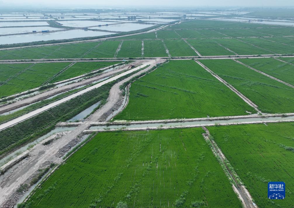 河北省唐山市豐南區黑沿子鎮由鹽堿地改良而成的水稻田(7月20日攝,無人機照片)。