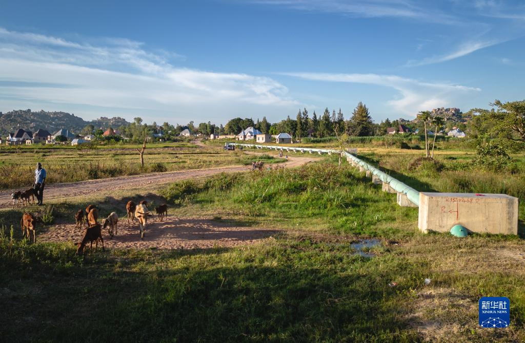 這是6月11日在坦桑尼亞姆萬扎省薩哈一處沼澤地拍攝的供水項目輸水管道(無人機照片)。