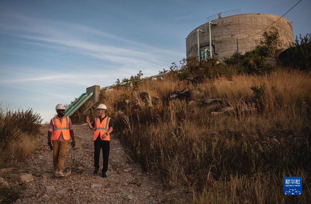 6月12日,凱爾文(左)在坦桑尼亞姆萬扎省布斯韋盧供水項目高位蓄水池旁與同事交流。