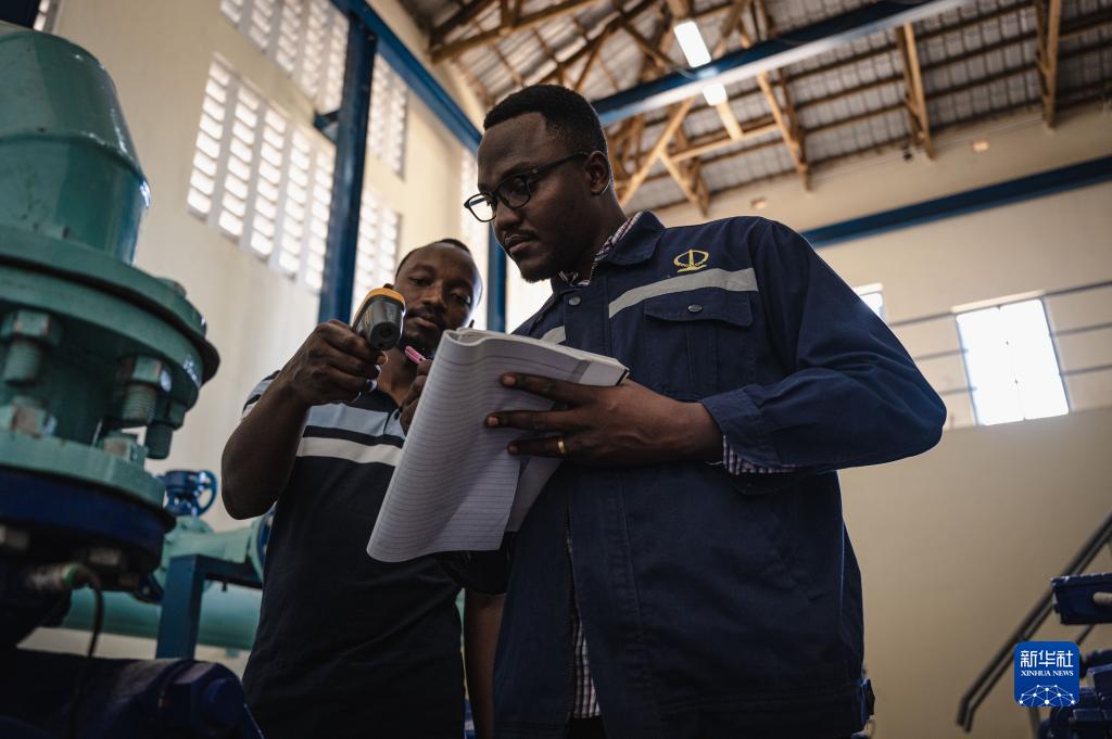 6月11日,在坦桑尼亞姆萬扎省奇塞凱,凱爾文(右)在供水項目增壓泵站內記錄水泵工作情況。