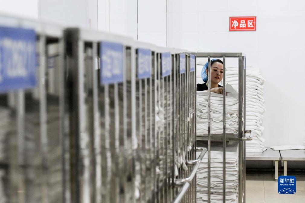 在牡丹江客運段牡(牡丹江)整備車間,洗滌二班班組長李濱在整理干凈整潔的臥具備品(7月19日攝)。