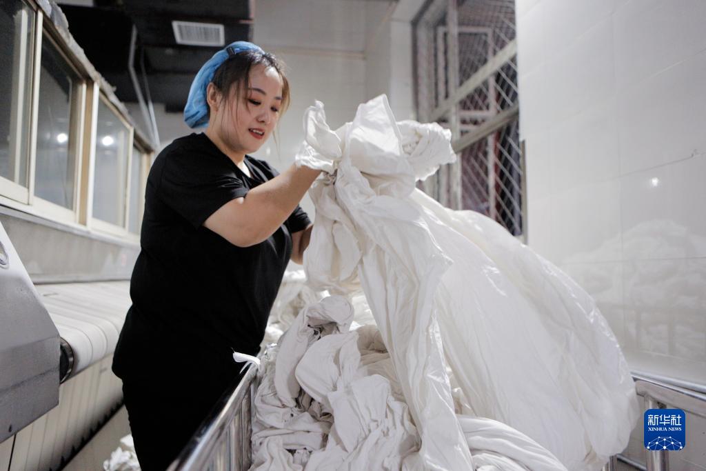 在牡丹江客運段牡(牡丹江)整備車間,洗滌二班班組長李濱整理清洗后的列車臥具備品(7月19日攝)。