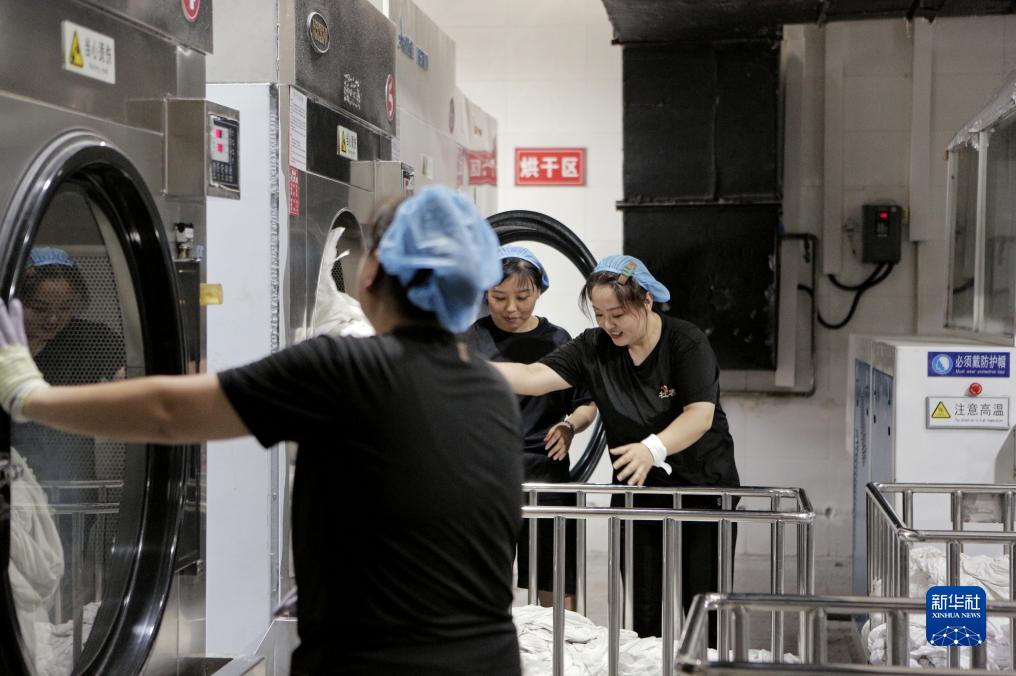 在牡丹江客運段牡(牡丹江)整備車間,洗滌二班班組成員把清洗后的列車臥具備品送進烘干機(7月19日攝)。