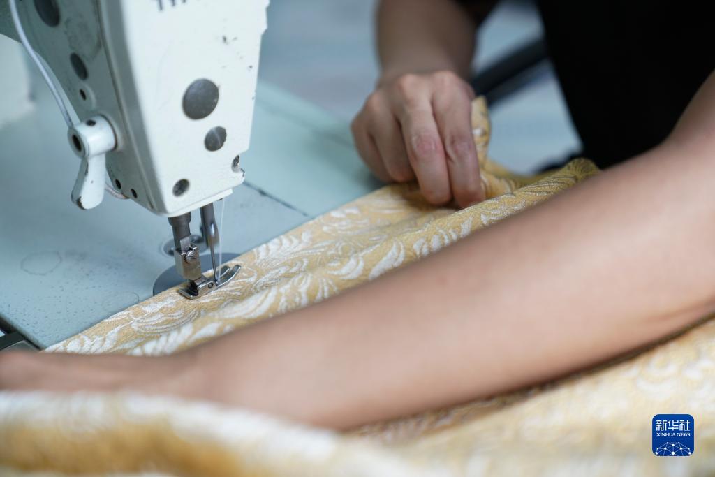 在牡丹江客運段牡(牡丹江)整備車間,洗滌二班的一名班組成員用縫紉機縫制加固列車臥具備品(7月19日攝)。