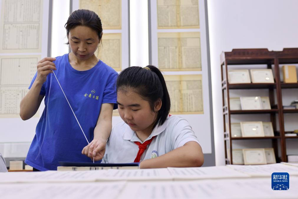 7月20日,在河北省滄州市吳橋縣河北線裝書博物館,工作人員教吳橋縣新華小學學生學習線裝書制作技藝。