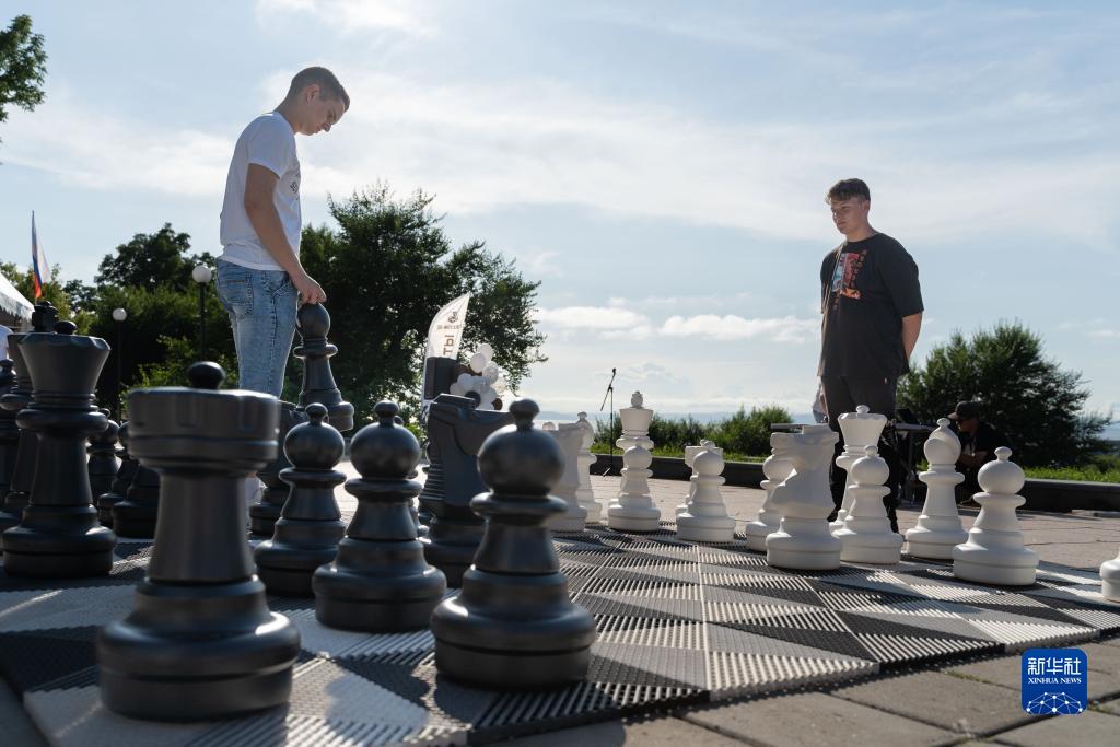 7月20日,在俄羅斯遠東城市符拉迪沃斯托克,人們參加街頭國際象棋比賽。