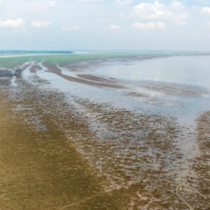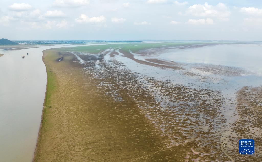7月20日,鄱陽湖都昌印山附近水域大面積湖床裸露(無人機照片)。