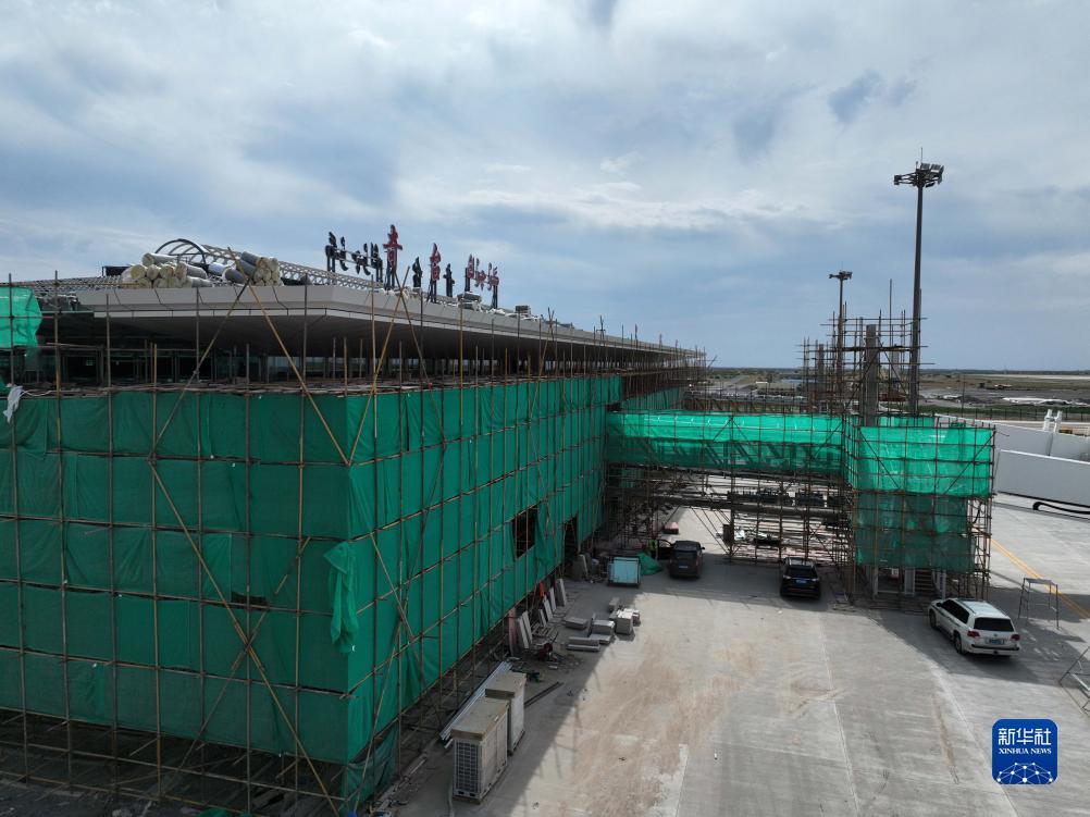 這是正在進行外立面裝飾施工的新疆奇臺江布拉克機場航站樓(7月20日攝,無人機照片)。
