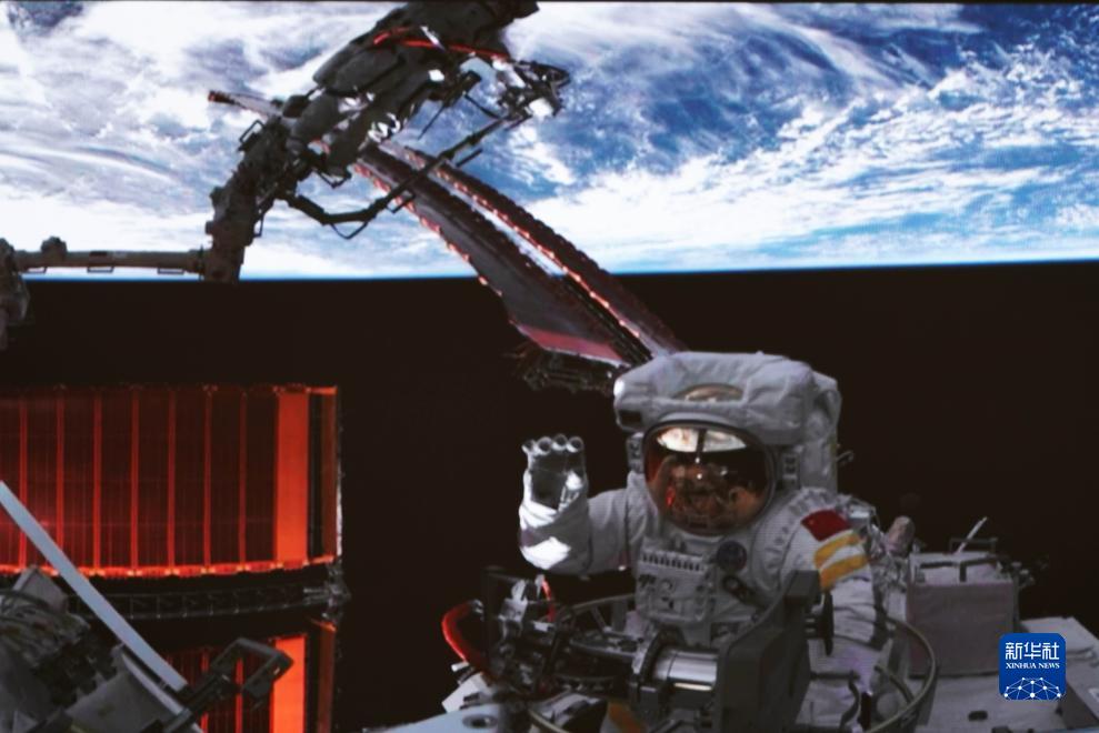 這是在北京航天飛行控制中心拍攝的神舟十六號航天員朱楊柱成功出艙后揮手致意的畫面(7月20日攝)。