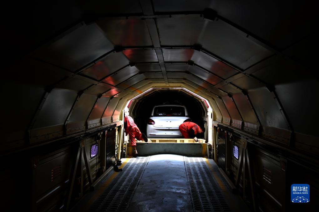 這些小汽車“乘坐”的火車是JSQ6型雙層運輸汽車專用鐵路貨車,每節車廂兩端都可以打開,在車廂連接處鋪上擋板,相鄰的車廂就可以連起來形成通道。每節車廂可以裝載9至15輛小汽車。其中一部分小汽車會“坐”著火車,通過鐵海聯運班列運往海外。