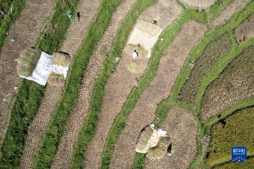 7月20日,農民在印度尼西亞西爪哇省茂物地區的鄉間收獲稻米(無人機照片)。