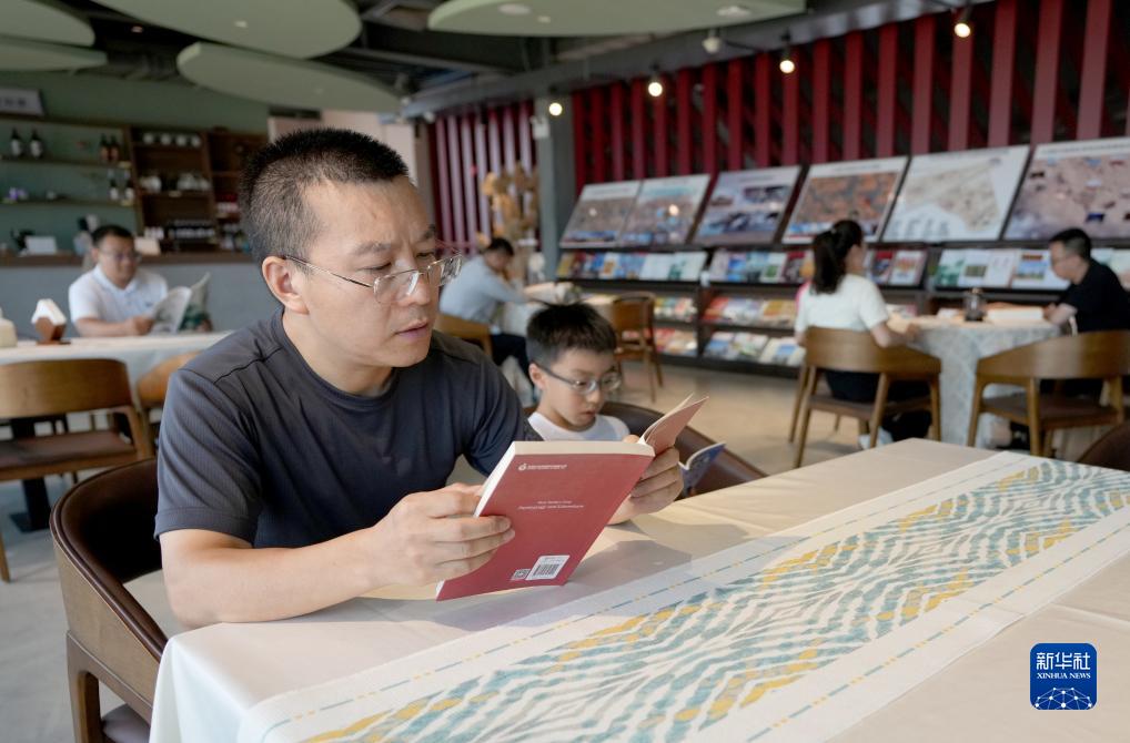 7月20日,來自四川成都的游客張青山與兒子一起在位于寧夏中衛市騰格里沙漠大漠星河度假區的沙漠圖書館看書。
