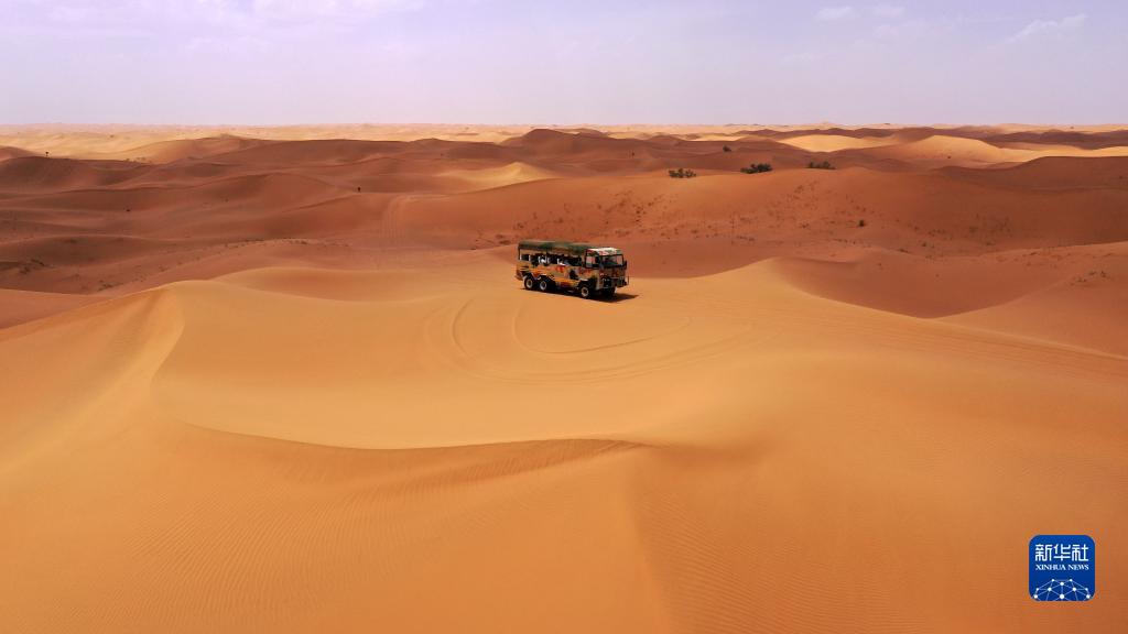 7月20日,游客在寧夏中衛市沙坡頭景區體驗沙漠沖浪車(無人機照片)。