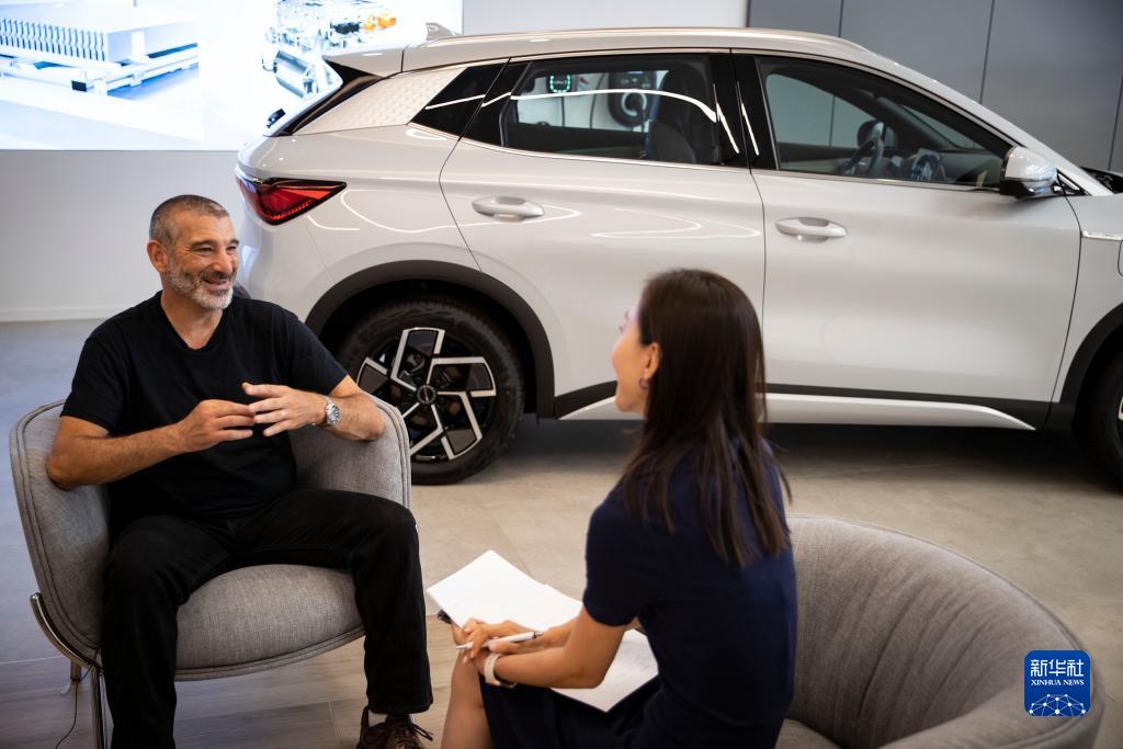 7月17日,在以色列特拉維夫一家比亞迪銷售點,以色列財經媒體《經濟學人報》汽車版作家托默·哈達爾接受新華社記者采訪。