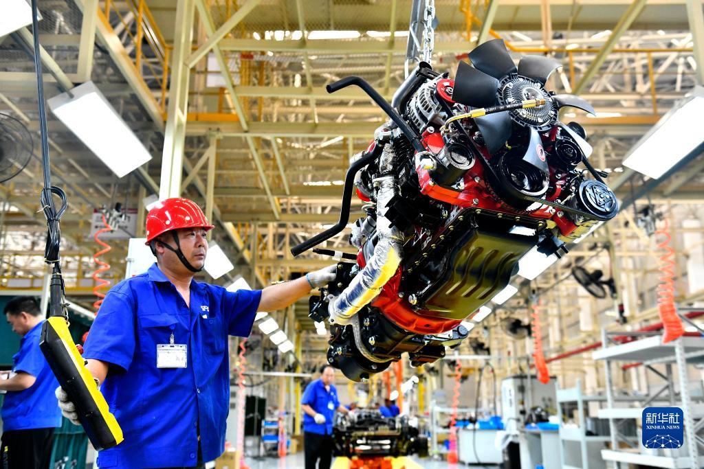 7月21日,在位于威海市文登區的濰柴新能源商用車有限公司,工人在生產線上吊裝發動機。